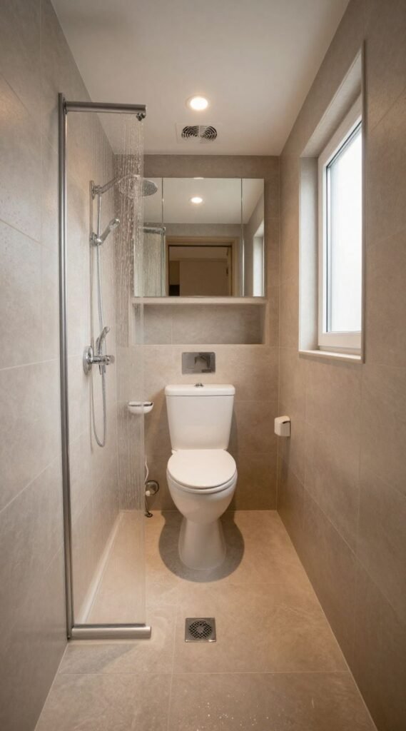 Pro tip go with large format tiles to visually expand space. It works because compact doesnโt mean cramped.